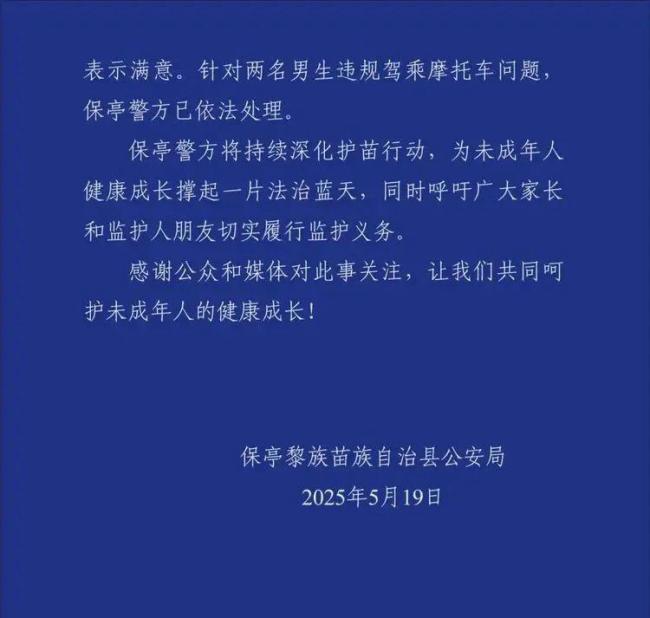 5月18日下午,保亭警方联合三名涉事学生所在学校组织双方家长和学生进行调解。两名男生表示已认识到错误并向陈某及其女儿道歉,写下承诺书。两名男生的家长也表示将对其严加教育,双方家长对调解结果表示满意。针对两名男生违规驾乘摩托车的问题,保亭警方已依法处理。