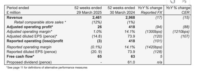 博柏利宣布了组织变革以应对充满挑战且不断变化的全球市场,约1700个职位受到影响,但没有大规模关闭门店的计划。5月14日,该公司公布了截至3月29日的2025财年财务数据,营收为24.61亿英镑,同比减少17%,略高于预期;营业利润为-300万英镑,调整后营业利润为2600万英镑,同比下滑94%。公司预计改革措施将在2027财年前带来额外的6000万英镑成本节省,使公司能够继续为最重要的增长机会提供资金。这些举措包括削减采购和房地产方面的成本,人员方面的成本也将降低。