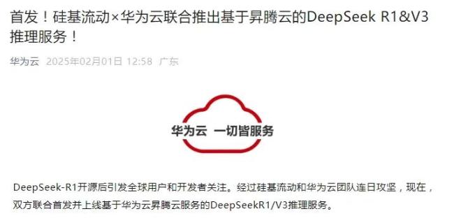 可仅仅2周之后,2月1日(大年初四),华为云就联合硅基流动基于昇腾云推出DeepSeek R1/V3,引爆全网。