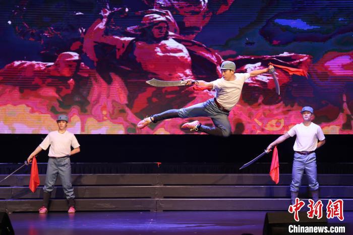 当地时间5月18日晚,加拿大华人团体携手呈现的大型音乐舞蹈史诗《和平颂》在大多伦多地区密西沙加市上演,以纪念世界反法西斯战争暨中国人民抗日战争胜利80周年。图为演员们表演武术舞蹈《大刀进行曲》。中新社记者 余瑞冬 摄