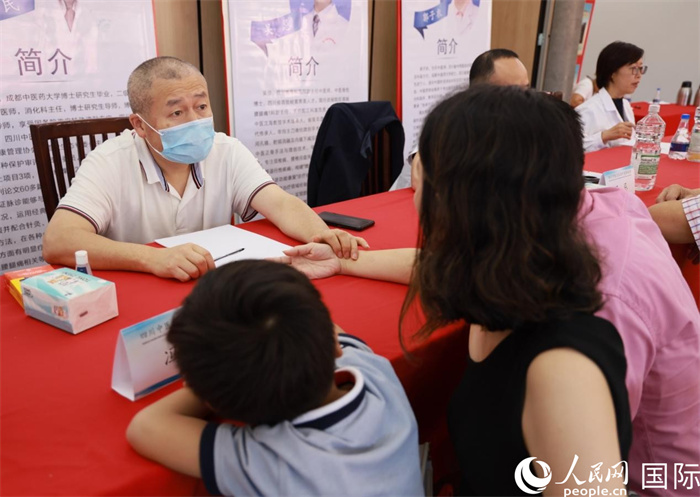 活动现场,成都中医药大学附属医院消化内科主任冯培民正在为当地侨胞把脉。人民网记者 宋亦然摄