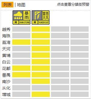 受西南方向移近的强雷雨云团影响,从5月19日13时34分起,广州市越秀区、天河区雷雨大风黄色预警信号生效。13时50分,白云区、海珠区、黄埔区、花都区、荔湾区、南沙区、番禺区、增城区也发布了雷雨大风黄色预警信号,荔湾区、番禺区、花都区还发布了暴雨黄色预警信号。广州市气象灾害应急指挥部决定从5月19日13时45分起启动广州市气象灾害(雷雨大风)Ⅳ级应急响应。据广州天气报道,南沙、番禺和荔湾都有站点录得8级左右的阵风。