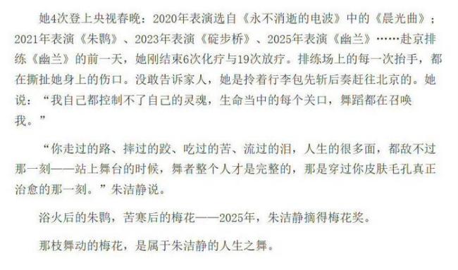 原来今年春晚前朱洁静在排练的前一天刚接受完6次化疗和19次放疗,她是带着化疗后的伤口抬手起舞。