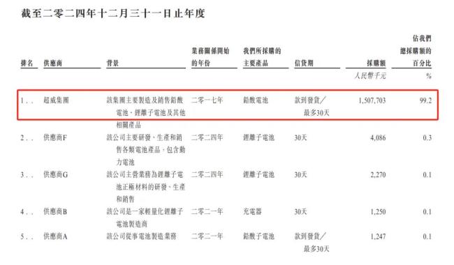 2022年-2024年,公司对第一大供应商超威集团的采购金额,分别占各期采购总额的98.5%、87.0%和99.2%。
