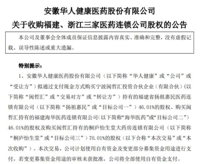 5月21日,华人健康发布公告称拟通过支付现金的方式,以合计3.27亿元金额购买宁波闽哲汇投资合伙企业(有限合伙)持有的三家连锁公司股权。在行业整体放缓扩张步伐的背景下,华人健康这一举动引发了市场的广泛关注。