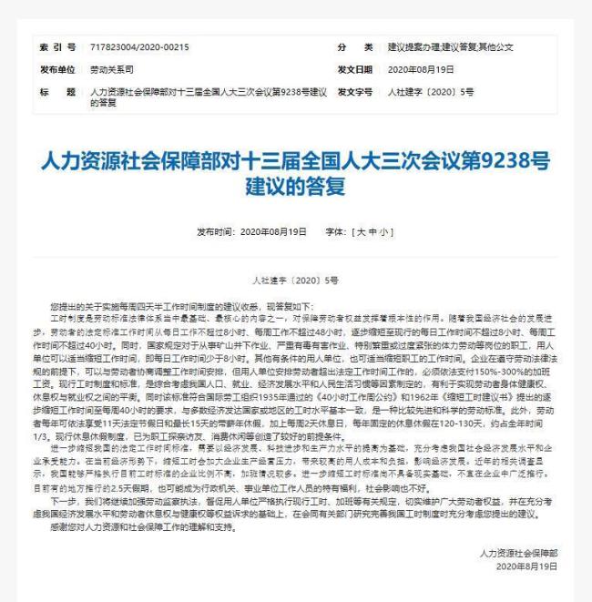 相反,一些企业根据实际情况自行推行4.5天工作制反而更容易一些。关于4.5天工作制,官方此前已有定论。2020年8月,人社部在回复全国人大代表的建议中指出,进一步缩短工时标准尚不具备现实基础,不宜在企业中广泛推行。现行工时制度和标准综合考虑了我国人口、就业、经济发展水平和人民生活习惯等因素,有利于实现劳动者身体健康权、休息权与就业权之间的平衡。
