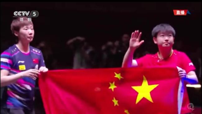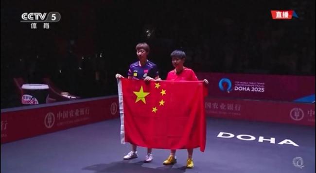 5月25日,2025多哈世乒赛女单决赛,孙颖莎以4比3战胜王曼昱,夺得冠军。比赛结束后,孙颖莎和王曼昱一起举起国旗,祝贺孙颖莎、王曼昱!