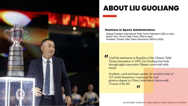 刘国梁坚信,只有当全球乒乓球整体水平提升,才能在更多国家和地区扩大乒乓球影响力,吸引更多青少年参与,使赛事获得更多关注和赞助,从而提升乒乓球项目及其球员的形象价值,实现可持续发展。他希望以中国力量推动世界乒乓球进步,建立世界乒乓球命运共同体,惠及各方,发挥乒乓球促进世界和平和团结的独特作用。