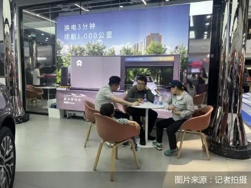 北京商报记者在蔚来、腾势、特斯拉等多家直营门店的洽谈区内看到,销售人员正在为到店的消费者计算购车的实际价格并讲解相关优惠政策,而在洽谈区的则多以家庭为购车单位的消费者。