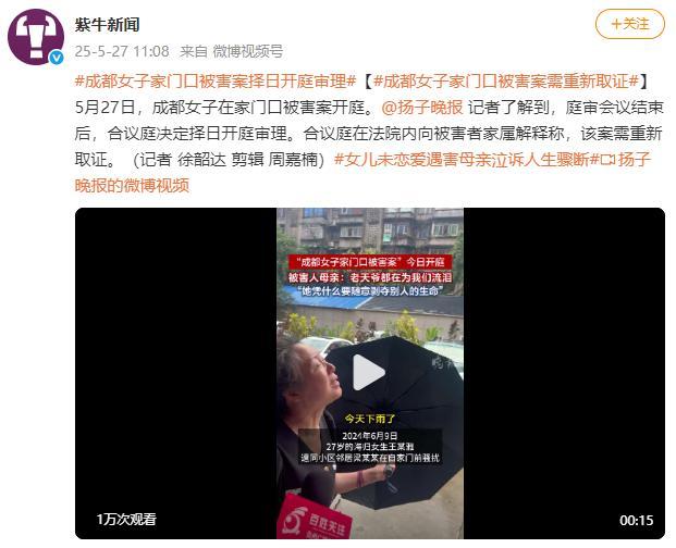5月27日,成都女子在家门口被害案开庭。庭审结束后,合议庭决定择日审理此案,理由是需要重新取证。