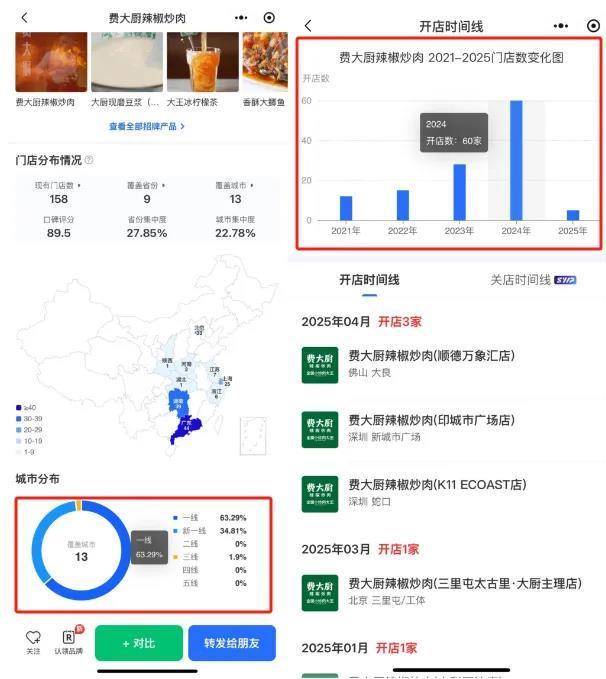 《中国炒菜餐厅行业发展白皮书》显示:辣椒炒肉是国民炒菜第一。凭借大单品路线和厨师标准化,费大厨顺利走出湖南,并进入深圳、上海、北京、广州等一线城市。据窄门餐眼数据,费大厨拥有158家门店,绝大部分集中在一线和新一线城市,超60%为商场店。去年以来,费大厨加速扩张,一年新增门店60家。