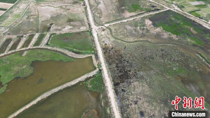 5月27日,位于甘肃张掖市高台县黑河湿地保护区的荒漠与湿地共生共美。该保护区南依祁连山国家级自然保护区,北靠巴丹吉林沙漠,处于河西走廊“蜂腰”地带,是中国西北地区自然保护区网络的重要节点。图为荒漠与湿地尽显自然之韵。(无人机图片) 戴文昌 摄