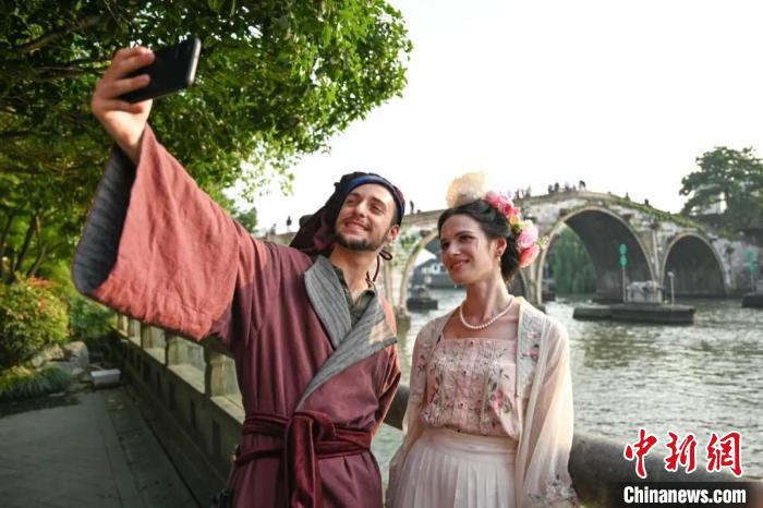 外国友人在拱宸桥畔拍照。(资料图)王刚 摄