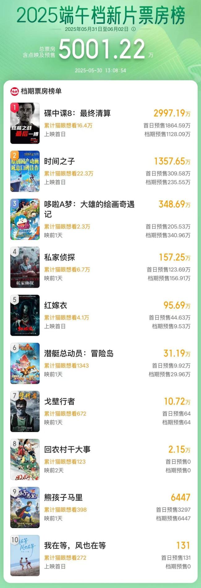 截至5月30日13时08分,2025年端午档新片预售总票房(含点映)突破了5000万。其中,《碟中谍8:最终清算》在预售票房榜上表现突出,领跑其他新片。