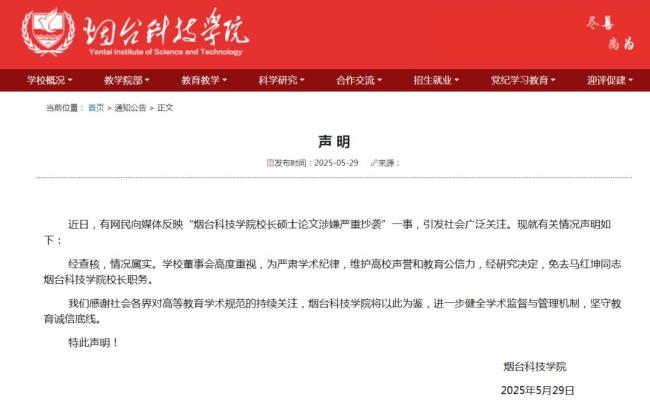 近日,“烟台科技学院校长硕士论文涉嫌严重抄袭”一事引发社会广泛关注。5月29日,烟台科技学院对此事发布声明,经核查,情况属实。学校董事会研究决定,免去马红坤烟台科技学院校长职务。
