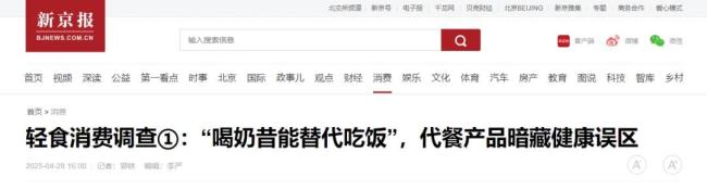 再如,新京报在4月28日报道轻食、代餐食品宣传乱象时表示,“不少消费者被商家宣称的低碳水、低热量、高蛋白、高膳食纤维等卖点吸引,期待在减重、塑身道路上“躺赢”。而事实上,其中暗藏消费陷阱和健康误区。”