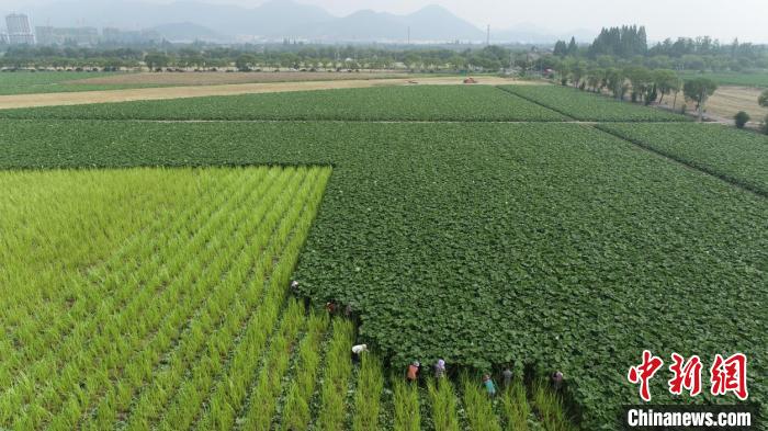 在湖州市吴兴区埭溪镇上强村,从上空俯瞰百亩田地,宽大的青绿叶片随风晃动,层层叠叠遮住了泥土,这些植株便是山露。当地农户经过多年摸索,种植技术日渐成熟,发展出“菜稻轮作”新模式,将山露出口至日本等地,曾经的“野菜”成了致富菜。