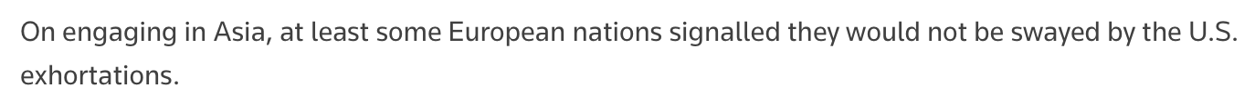 文章注意到欧盟外交与安全政策高级代表卡娅·卡拉斯的发言,称她似乎将欧盟定位为亚洲富有成效的合作伙伴。她认为,亚洲或许可以成为一种新选择,以应对美国如今的日益反复无常、奉行保护主义,以及不再重视基于规则的国际秩序。