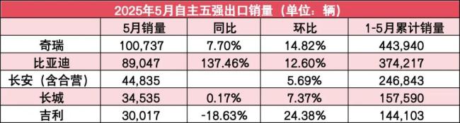而长安(含合营企业)、长城和吉利5月出口量则均在3万-4万辆的水平。其中,长安出口量为44,785辆,此前数据缺失无同比数据,环比增长5.69%;长城为34,535辆,同比增长0.17%,环比增长7.37%;吉利为30,017辆,同比下降20%,环比增长5.69%。