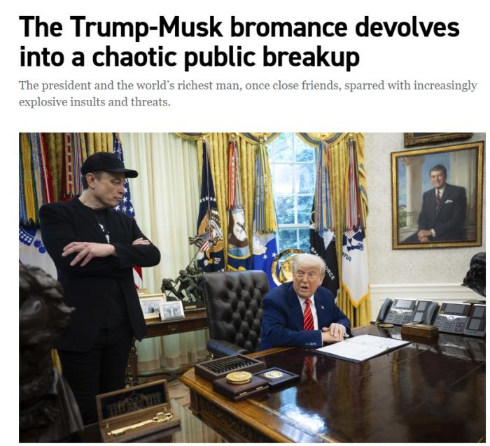 中新网6月6日电 综合外媒报道,近日,美国总统特朗普与亿万富翁马斯克的“亲密关系”似乎破裂了。当地时间5日,两人因“大而美”税改法案产生的分歧升级为“公开争吵”。