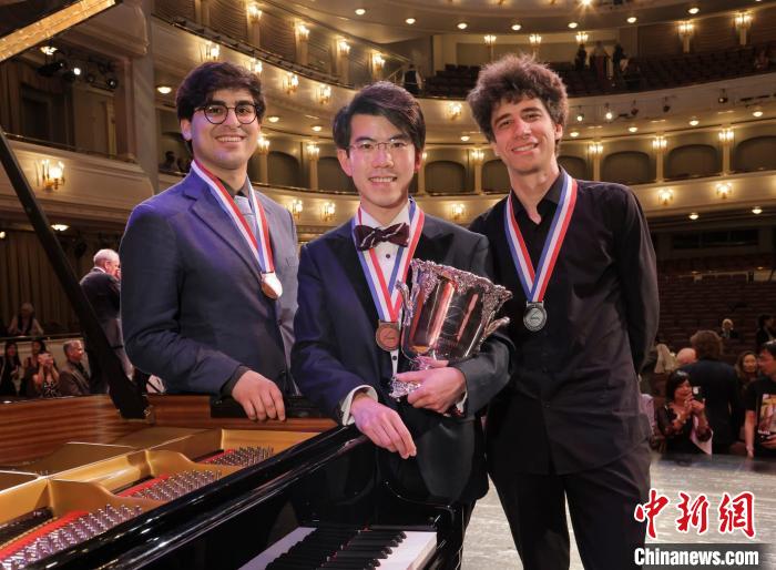 6月8日,范·克莱本国际钢琴比赛公布,年仅29岁的香港钢琴家沈靖韬(中)在第十七届范·克莱本国际钢琴比赛中夺冠。范·克莱本国际钢琴比赛供图