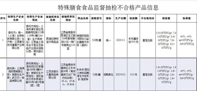 其中,江苏孩享乐儿童用品有限公司销售的、标称上海涓海贸易有限公司委托湖北省武汉贝一食品有限公司生产的禾泱泱婴幼儿有机稻鸭原生泡芙条(菠菜味)菌落总数不符合食品安全国家标准规定。