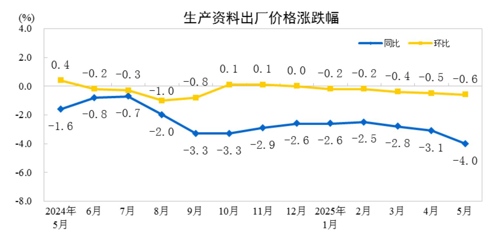 国家统计局:5月份工业生产者出厂价格同比下降3.3%
