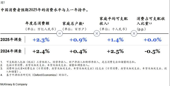 报告数据显示,2025年的“年度总消费额”预计增长2.3%,和2024年调查时增长2.4%的预期基本持平。尽管中国消费者对2025年家庭收入增长率的平均预期仅为1.4%,低于2024年的2.5%。但“消费占可支配收入比重”由-0.5%变为0.0%。