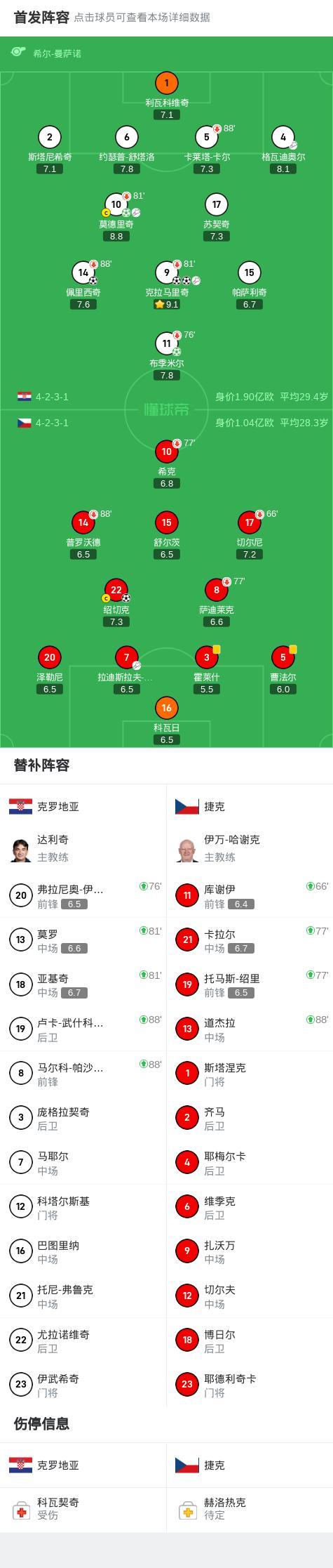 第41分钟,格瓦迪奥尔助攻克拉马里奇头球接力破门,克罗地亚取得领先。第53分钟,莫德里奇禁区外远射稍稍偏出。第57分钟,绍切克在禁区后点头球破门,捷克扳平比分。第62分钟,布季米尔造点,莫德里奇点射命中,克罗地亚再次领先。第68分钟,佩里西奇在禁区内停球后低射远角得手。第71分钟,布季米尔罚中点球,克罗地亚扩大优势。第75分钟,莫德里奇精准直塞,克拉马里奇低射梅开二度,锁定胜局。第80分钟,捷克打门击中横梁,随后的补射被利瓦科维奇化解。