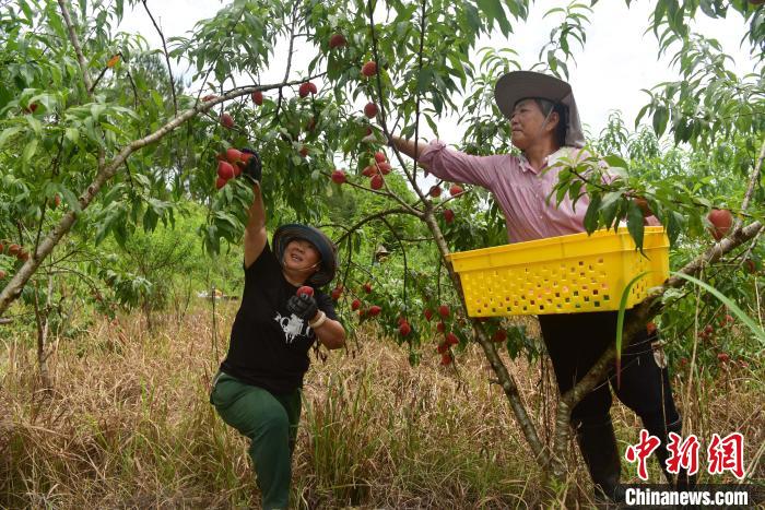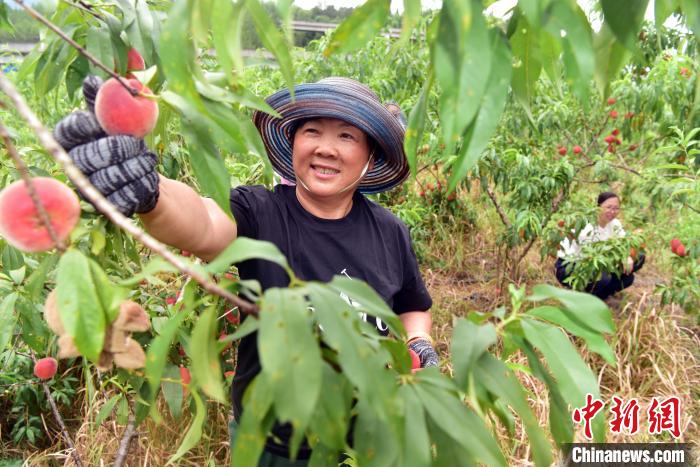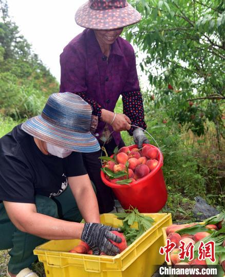 图为果农们忙着采摘桃子。中新社记者 张丽君 摄