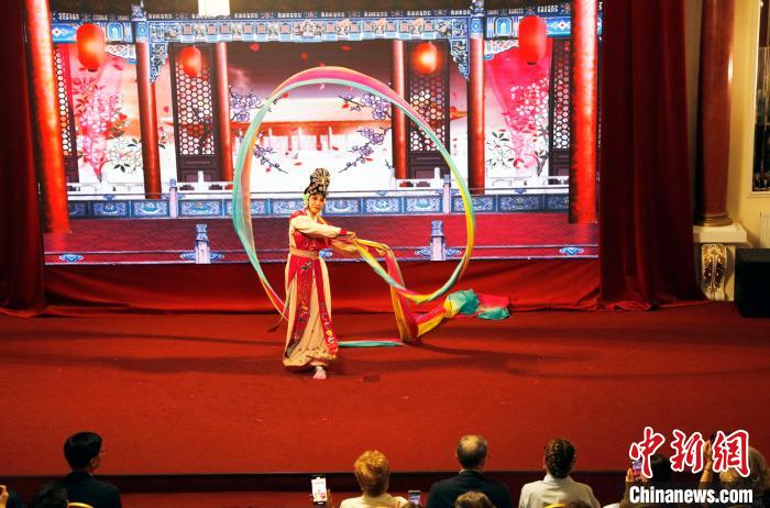当地时间6月9日,为庆祝北京市与莫斯科市结好30周年,“京剧文化之旅”系列活动在莫斯科举行。图为中国戏曲学院京昆系演员为观众表演梅派经典剧目《天女散花》选段。中新社记者 田冰 摄