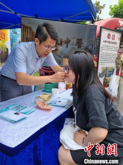 中新网上海6月12日电(记者 陈静)“我的痘痘为什么总是消不下去?”“眼睛总是干涩怎么缓解?”“为什么我常常感到心慌?”“为什么我总是白天昏昏欲睡,到了晚上却特别精神?”……6月12日,在上海的东华大学餐厅前的广场上,师生们向走进校园的中医专家们提出了很多问题,并一一得到了解答。专家们还时不时站起身来,为师生们示范如何按压穴位缓解肩颈疼痛等。