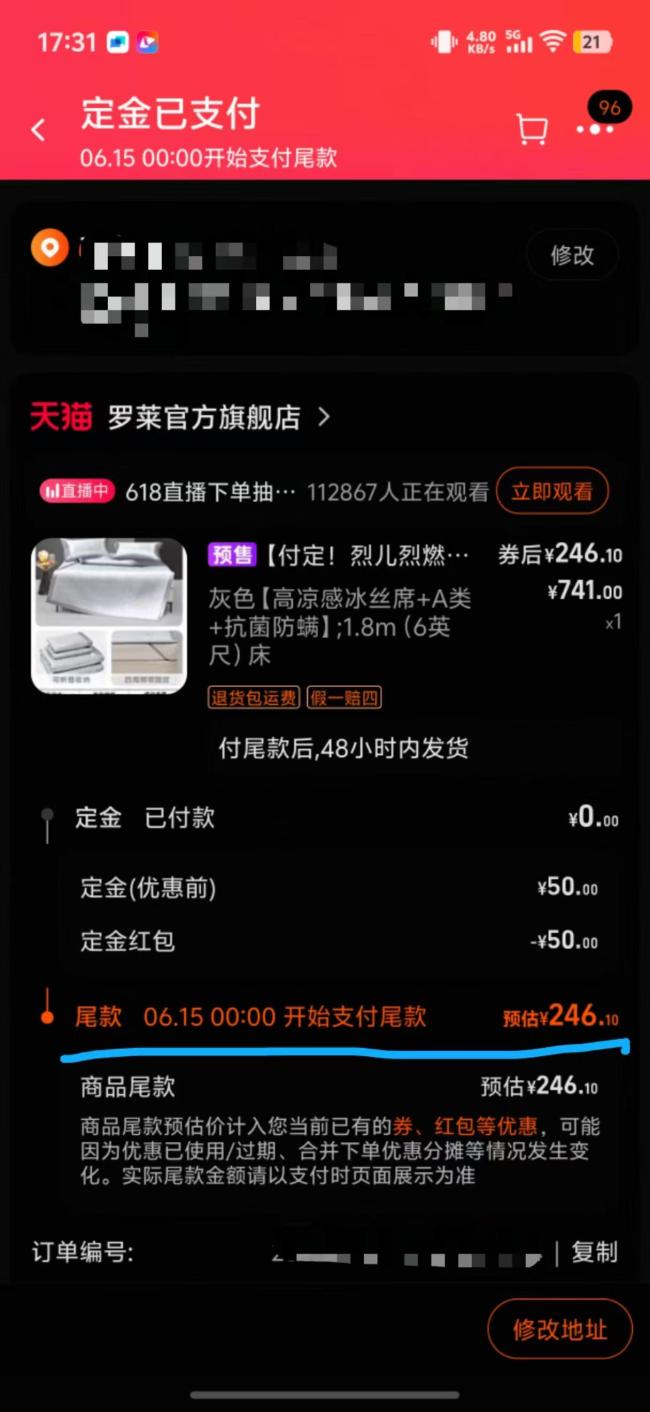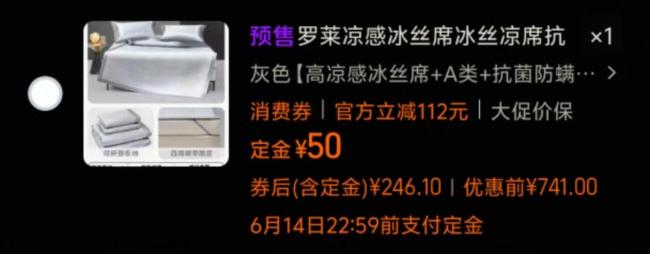 记者调查发现,罗莱凉席页面主图显示“专享价229元起,定金50元”,但未标明大尺寸价格,且定金是否包含在总价内也模糊不清。记者选择1.8×2m尺寸并加购,购物车明细显示“定金50元,券后(含定金)246.1元”。支付定金后,订单显示尾款为246.1元,价格发生变化,贵了50元。明码标价“含定金”付款后变成了“不含”。