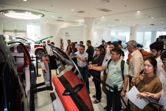 拉美学者在位于河北省保定市的长城汽车哈弗技术中心展厅参观新车型(6月13日摄)。新华社记者 黄昱璋 摄
