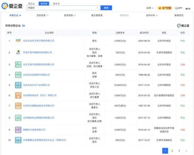 爱企查App显示,李国庆名下关联近30家企业,涉及图书、电商、科技等领域,其中近20家为开业状态。他在这些企业中担任法定代表人、董事长、执行董事等职务。俞渝名下关联25家企业,涉及图书、电商、供应链等领域,其中24家为开业状态。她在这些企业中担任法定代表人、总经理、执行董事等职务。目前,李国庆和俞渝二人仍共同关联10余家企业。