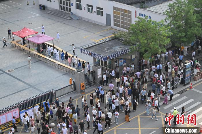 6月20日,山西省太原市第十五中学校,参加中考的考生排队进入考点。中新社记者 韦亮 摄