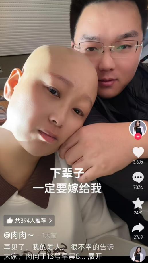 “肉肉”曾有一段婚姻,和前夫生了一个男孩。治疗期间,她的男友一直陪伴在身边。目前,“肉肉”的账号粉丝为23.3万。她曾发布视频称,化疗后大量脱发,病情恶化严重,甚至双眼失明。她的新年愿望是“没有疼痛,吃得下饭,睡得了觉,看得见路”。