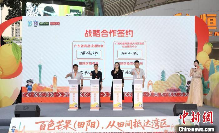 当日,田阳区商务局与广东省商品流通协会,田阳区投资促进局与广西对接粤港澳大湾区建设综合服务中心达成政府战略合作,16家粤桂企业达成推动百色芒果(田阳)以及“壮山农鲜”系列农产品高效“出桂入湾”购销合作。