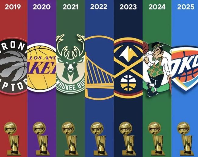 这七年间的总冠军分别是:2019年的猛龙、2020年的湖人、2021年的雄鹿、2022年的勇士、2023年的掘金、2024年的凯尔特人以及2025年的雷霆。