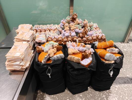 中新网6月24日电 据海关发布微信公众号消息,近日,北京海关所属大兴机场海关关员对出境航班进行监管时,发现一名旅客的行李物品机检图像异常。经开箱查验,现场关员在其托运行李中查获印有“POP MART”(泡泡玛特)品牌标识的玩偶和包装盒。经清点,共查获玩偶952个,塑料包装袋及纸质包装盒1586件。