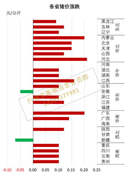 今日全国生猪价格整体上涨,局地小幅弱跌调整。全国21个省份均价上涨,2个省份均价下跌,其它省份均价持稳。均价最低省份为新疆,外三元生猪均价为13.33元/公斤;均价最高省份为广东,外三元生猪均价为15.70元/公斤。河北、广东猪价涨幅最大,环比上涨0.2元/公斤。