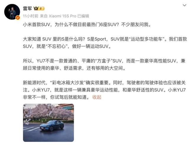 其中,为何不做6座suv引发不少同行关注。雷军说YU7不是一款普通的、平庸的方盒子SUV,而是一款豪华高性能的SUV。除此之外,他还表示,“冰箱彩电大沙发确实重要,但同时,驾驶者的体验也应该被关注。”这样的表述,或者说无意间将今年即将上市的几款SUV都无差别地纳入了扫射范围之中。