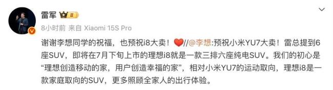 当日,理想CEO李想转发了雷军的这一条微博,并表示“相对于YU7的运动取向,理想i8是一款家庭取向的SUV,更多照顾全家人的出行体验。”随后雷军也转发了这条微博,双方互相预祝对方的产品成功。但是在一片和气之下,还是可以看出其中有一些火药味。理想的i8虽然瞄准的是家庭市场,但同样在20万-30万级别的市场中,两者在市场上的冲突并不是可以完全避免的。