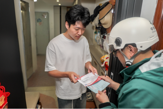 高考考了614分的施逸德同学从赵帅手中接过成绩单时喜出望外,尽管前一天已通过网络查询到分数,但当投递员冒雨将成绩单送到他手中时,他仍难掩激动:“这份‘仪式感’太珍贵了!”