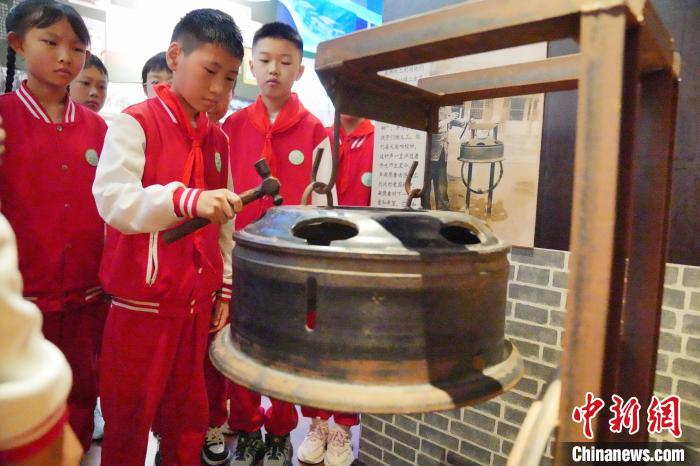 图为6月23日,低年级学生敲响校史馆里陈列的校钟,校钟是由南侨机工驾驶的汽车轮毂制作而成。中新社记者 刘冉阳 摄