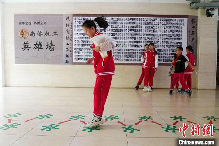 图为6月23日,课间休息时,学生在教室外活动,身后是学校搜集照片制作的南侨机工英雄墙。中新社记者 刘冉阳 摄