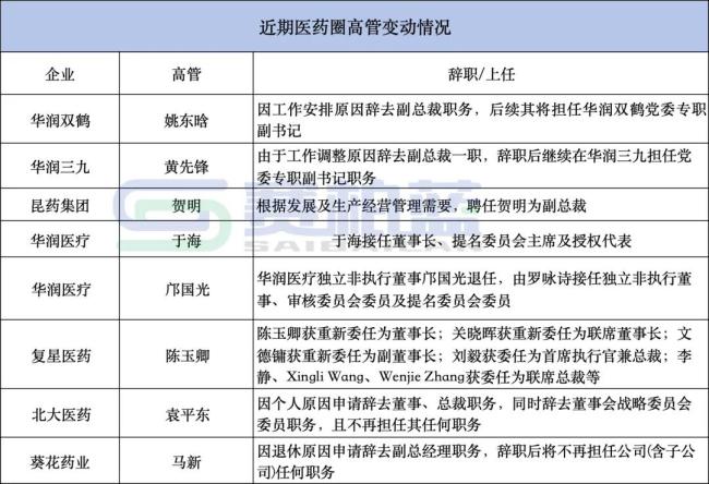 刚刚!医药圈人事大调整,华润三九、华润双鹤、北大医药...