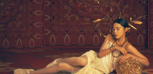辛芷蕾再创惊艳造型。6月30日,辛芷蕾在敦煌戈壁拍摄异域造型大片,身穿少数民族服饰,漫步沙漠并欣赏日落美景。