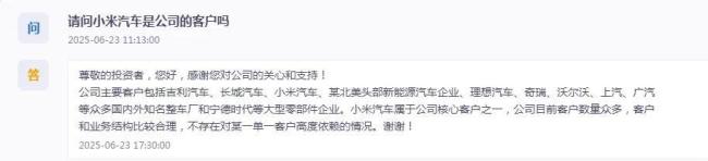 据6月23日互动易消息:公司主要客户包括吉利汽车、长城汽车、小米汽车、某北美头部新能源汽车企业、理想汽车、奇瑞、沃尔沃、上汽、广汽等众多国内外知名整车厂和宁德时代等大型零部件企业。小米汽车属于公司核心客户之一,公司目前客户数量众多,客户和业务结构比较合理,不存在对某一单一客户高度依赖的情况。