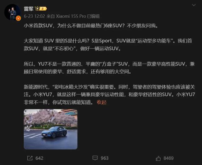 6月23日,雷军在微博发文,进一步解释了造YU7的初衷,表示不仅要“豪华运动性能”,也要兼具“豪华舒适性”。
